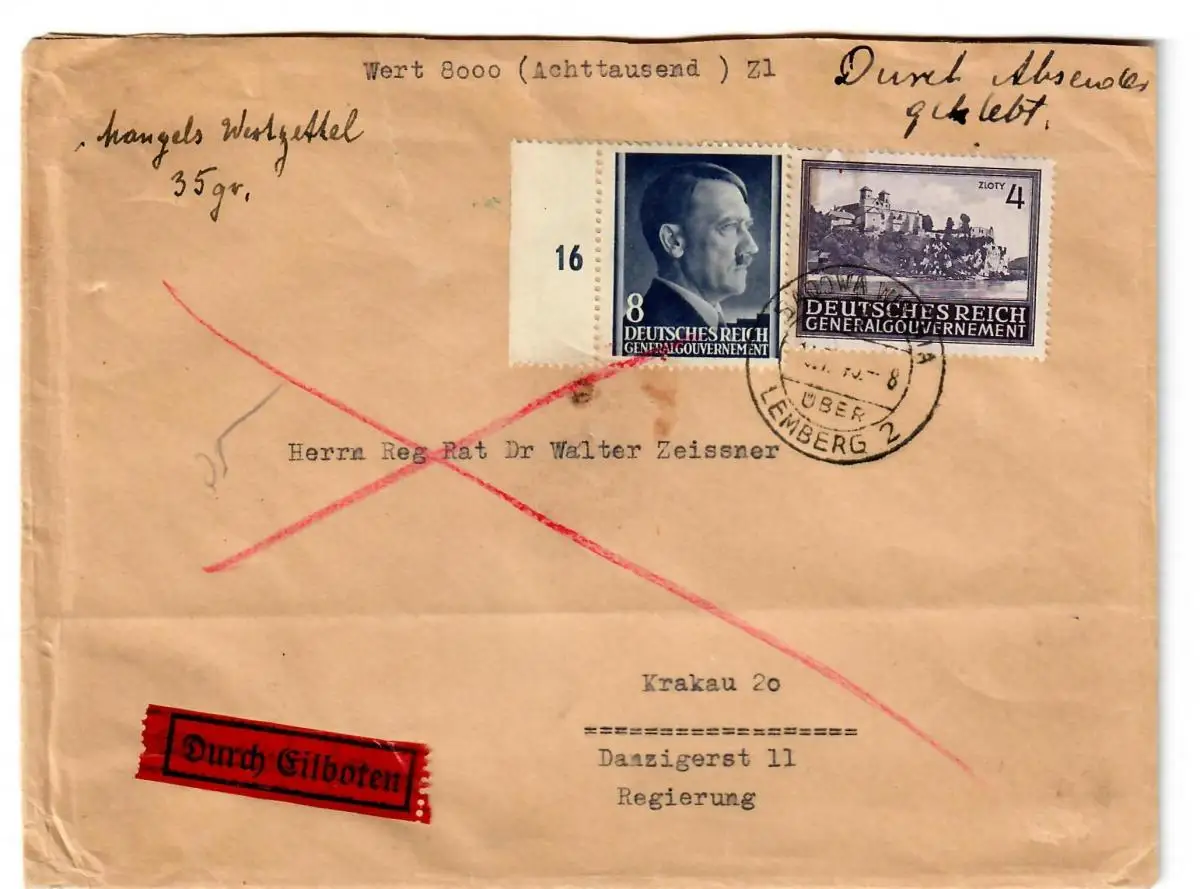 Voir Scan: Frais de traitement: 100 Frais d'indication de la valeur: 160 Porto 48 Eilboten 80 Main propre 20 Somme: 408 (marques sur le bord d 'une pièce justificatives sont coupées du scan, sauf mention contraire) Generalgouvernement, General Government Article Nr.: 942755 Examen: original Numéro d ’ article: 00000000942753