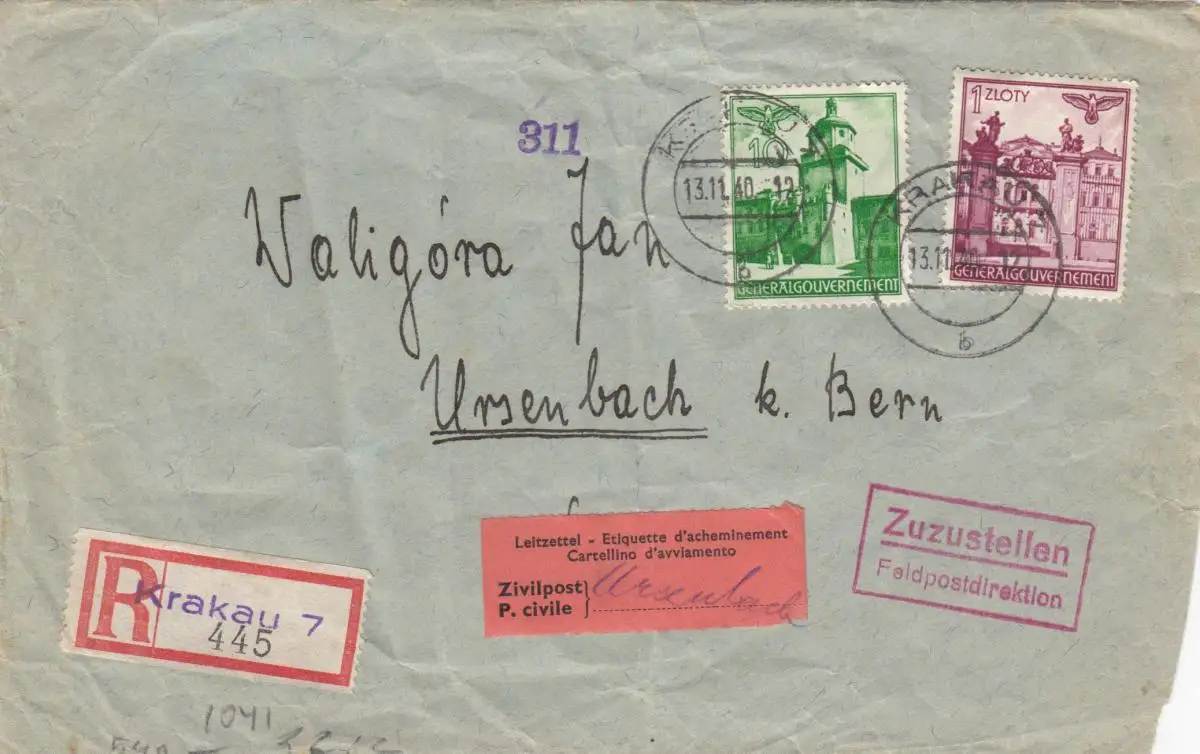 GG: Enregistrer Cracovie 7 vers Ursenbach, Internationenpost, 2x censure