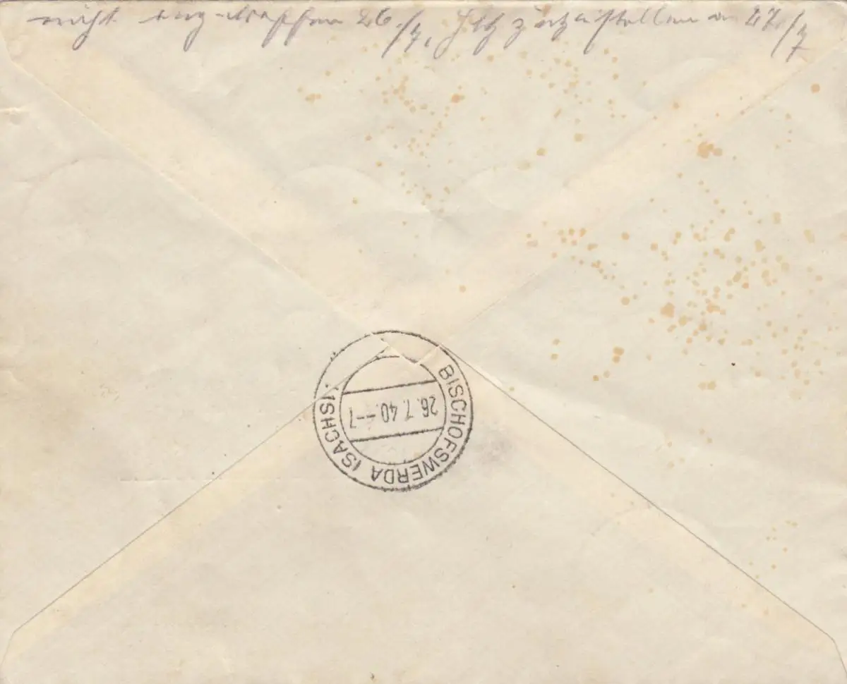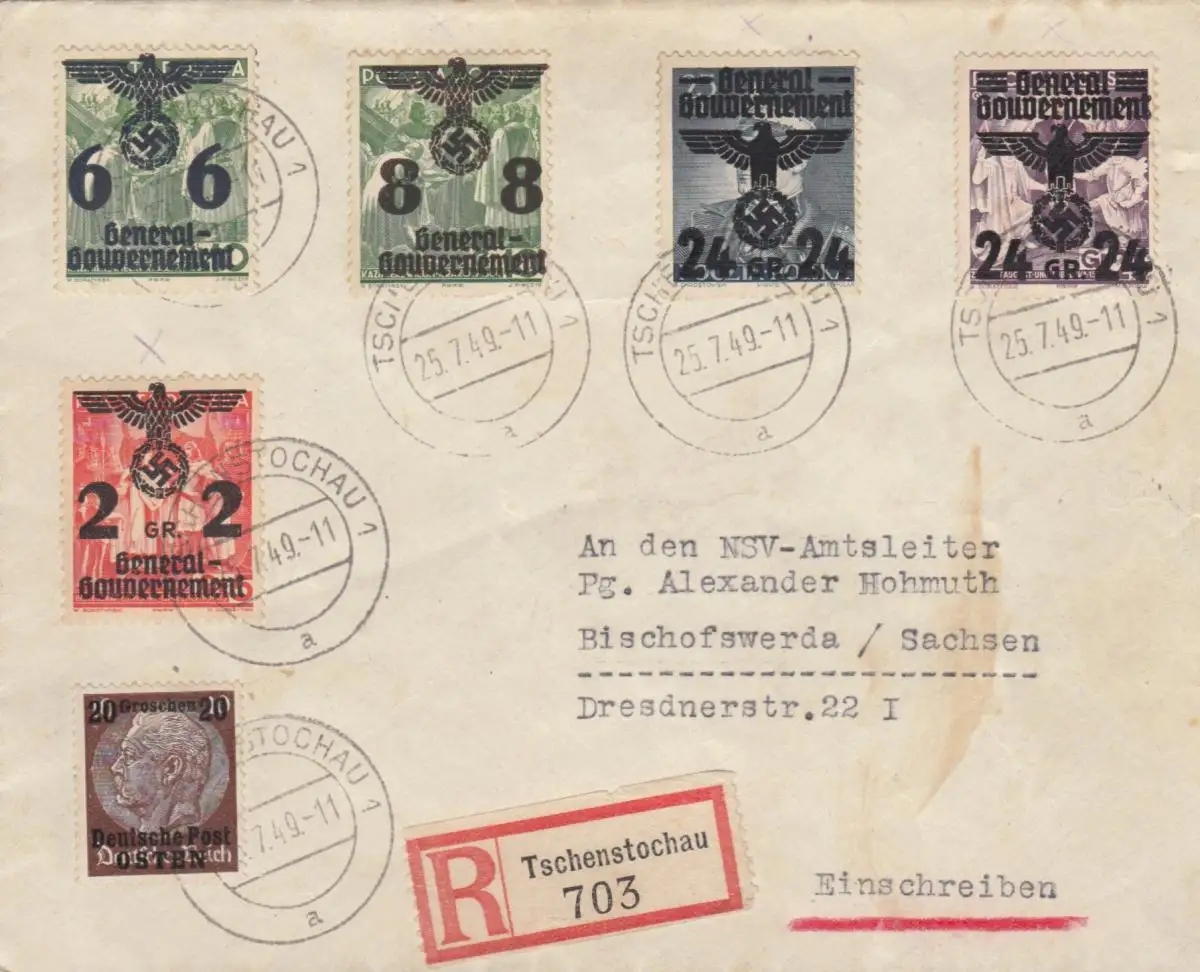 GG: lettre recommandée Chenstochowa, faux cachet 25.7.49 au lieu de 1940