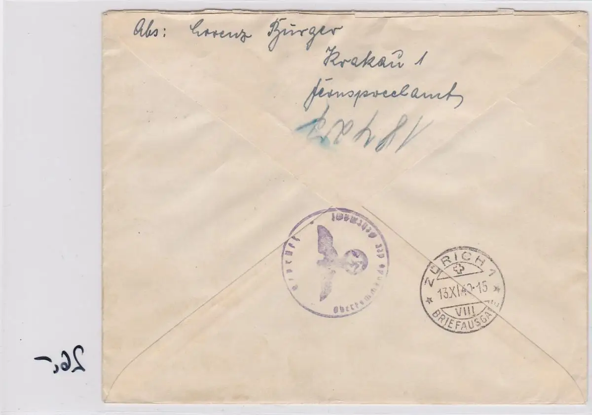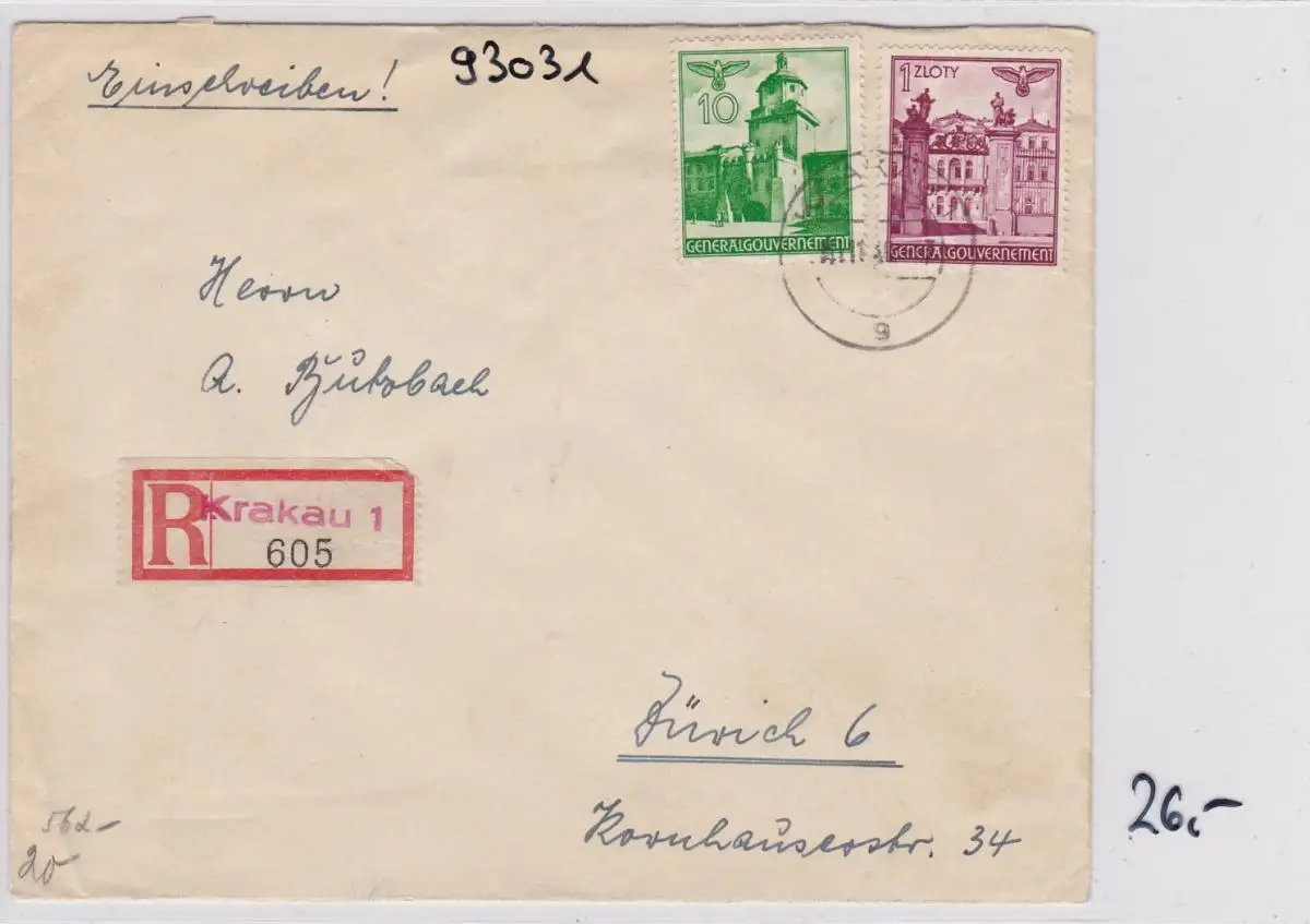 GG: Lettre recommandée de Cracovie à Zurich/Suisse- Cesurure