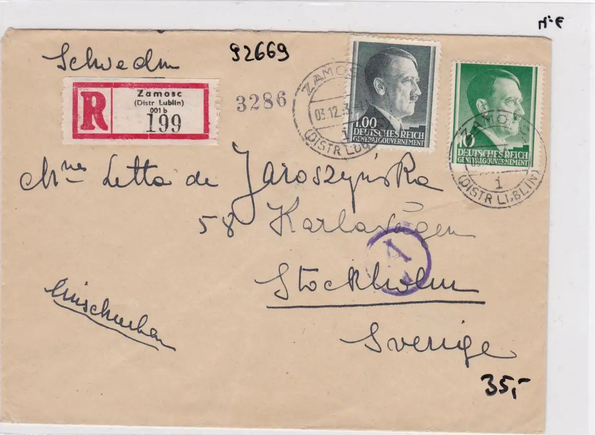 GG: lettre recommandée de Zamosc à la Suède/Zensur