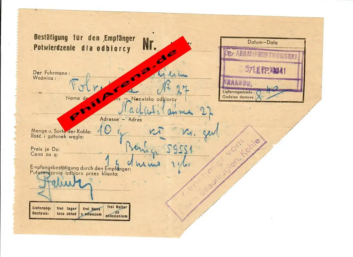 GG: Confirmation du destinataire du charbon par le transporteur à Cracovie 1941