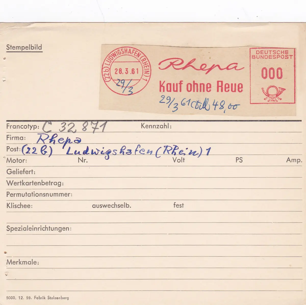 Les cartes d'archives du fabricant sont uniques. Ici avec l'utilisation ultérieure chez la famille Rhepa. Sur le dos, une copie est également indiquée. Date d ' utilisation initiale Voir Scan / Gouvernement général Article Numéro: 93644 Vérification: original Référence de l .article: 00000000093644