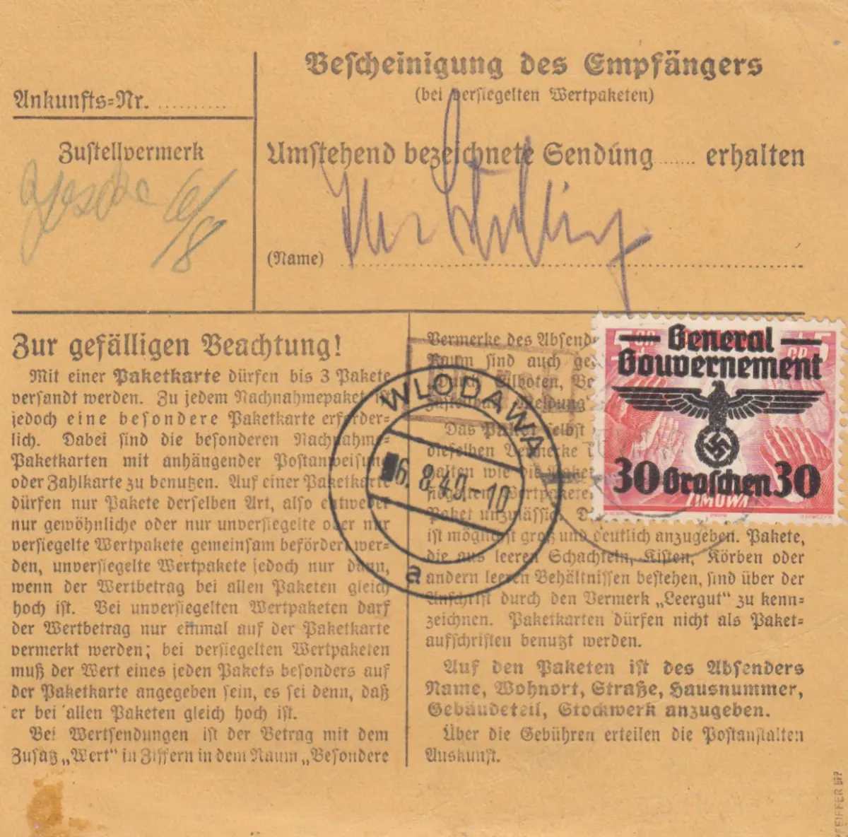 GG: Carte de colis intérieur Chelm-Uhrusk - Wlodawa, MeF 4x 30 Gr.