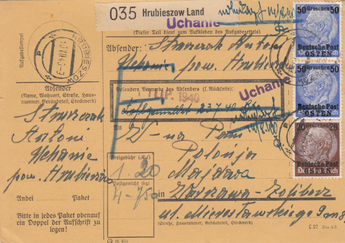 Carte de colis intérieur GG Hrubieszow/Uchanie Carte mal notifiée