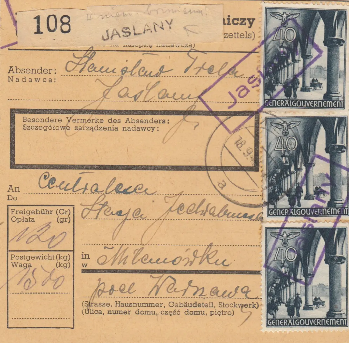 Carte intérieure de GG Jaslany vers Milanowek, MeF 40 Gr.