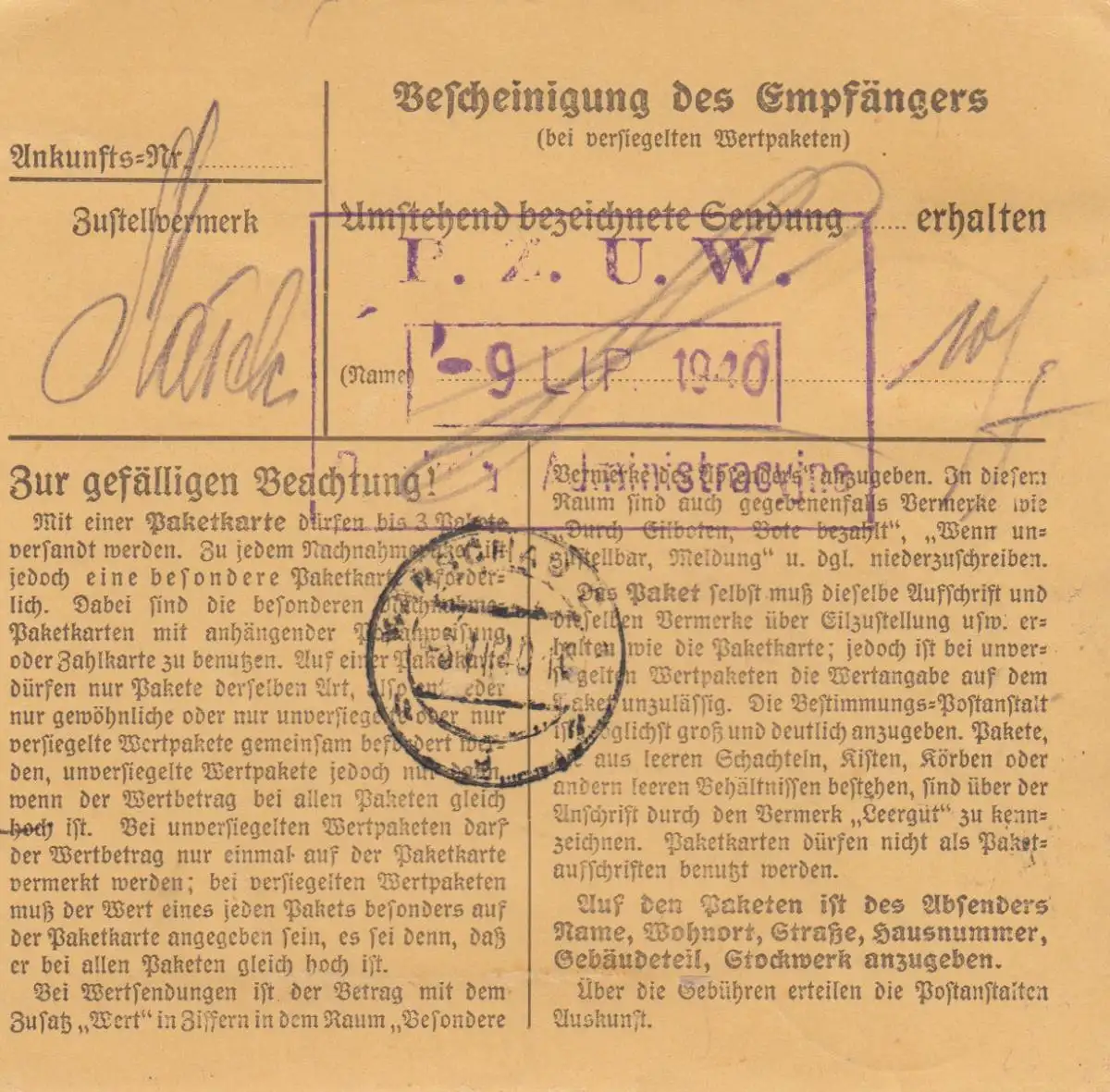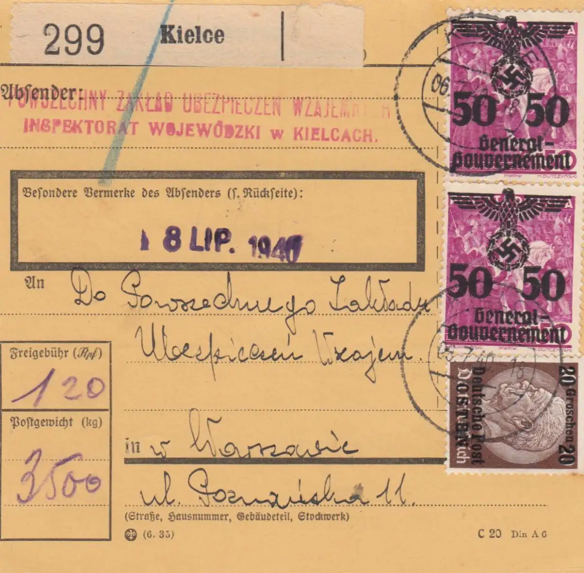 Carte de paquet intérieur GG Kielce vers Varsovie, carte anticipée