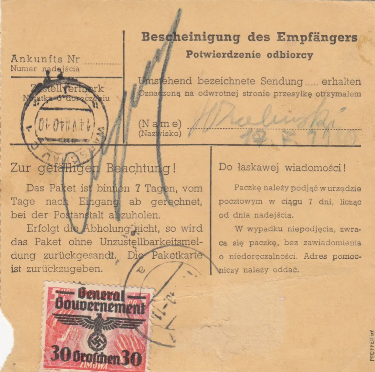 GG: Carte de colis intérieur Krynica-Warschau, MeF 4x 30 gr., 1x tombé