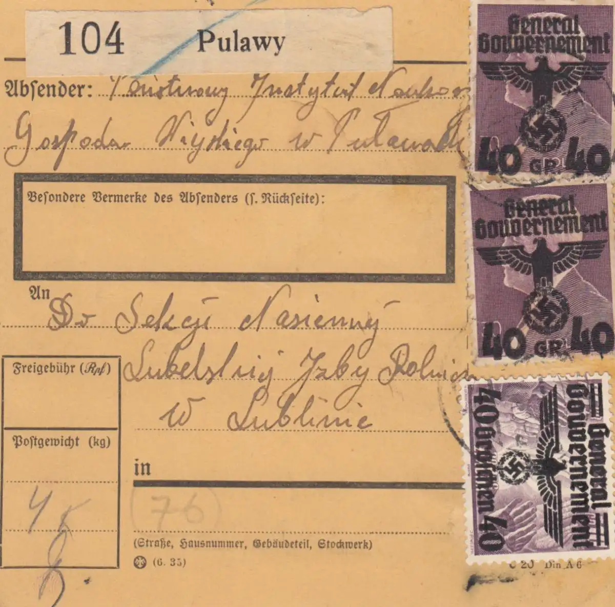 Carte de paquets intérieurs GG Pulawy vers Lublin, carte précoce