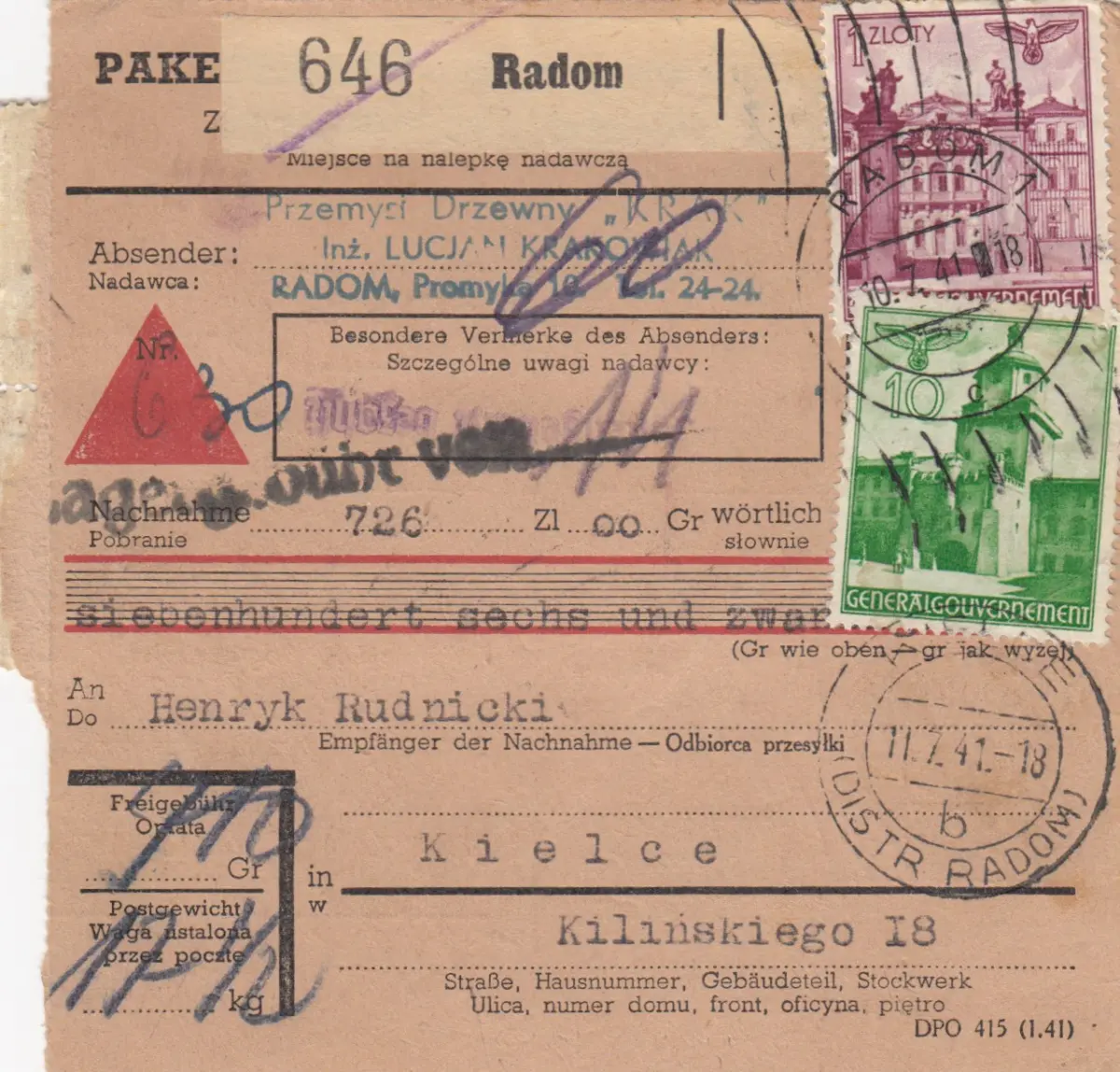 GG: Carte de colis intérieur Radom vers Kielce en remboursement avec frais de stockage