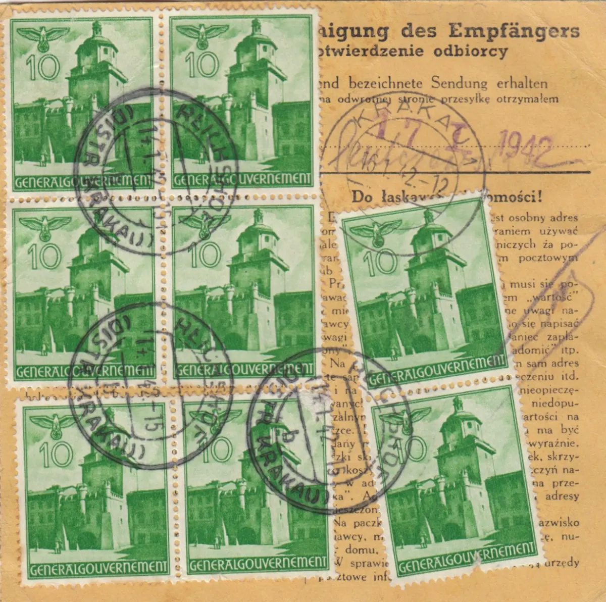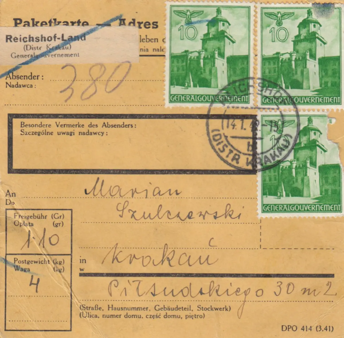 GG: Carte de colis intérieur Reichshof-Krakau, francon de masse MeF 10Gr, Bug