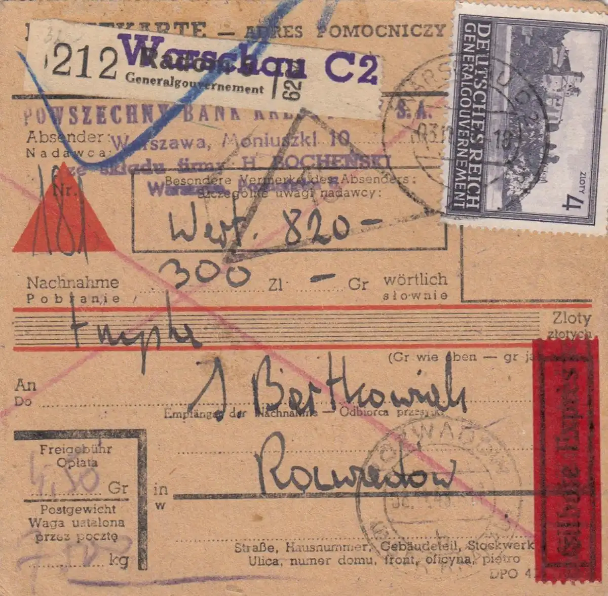 Carte de colis intérieur GG Varsovie Accueil, valeur ouverte, courrier postal vers Rozvadov