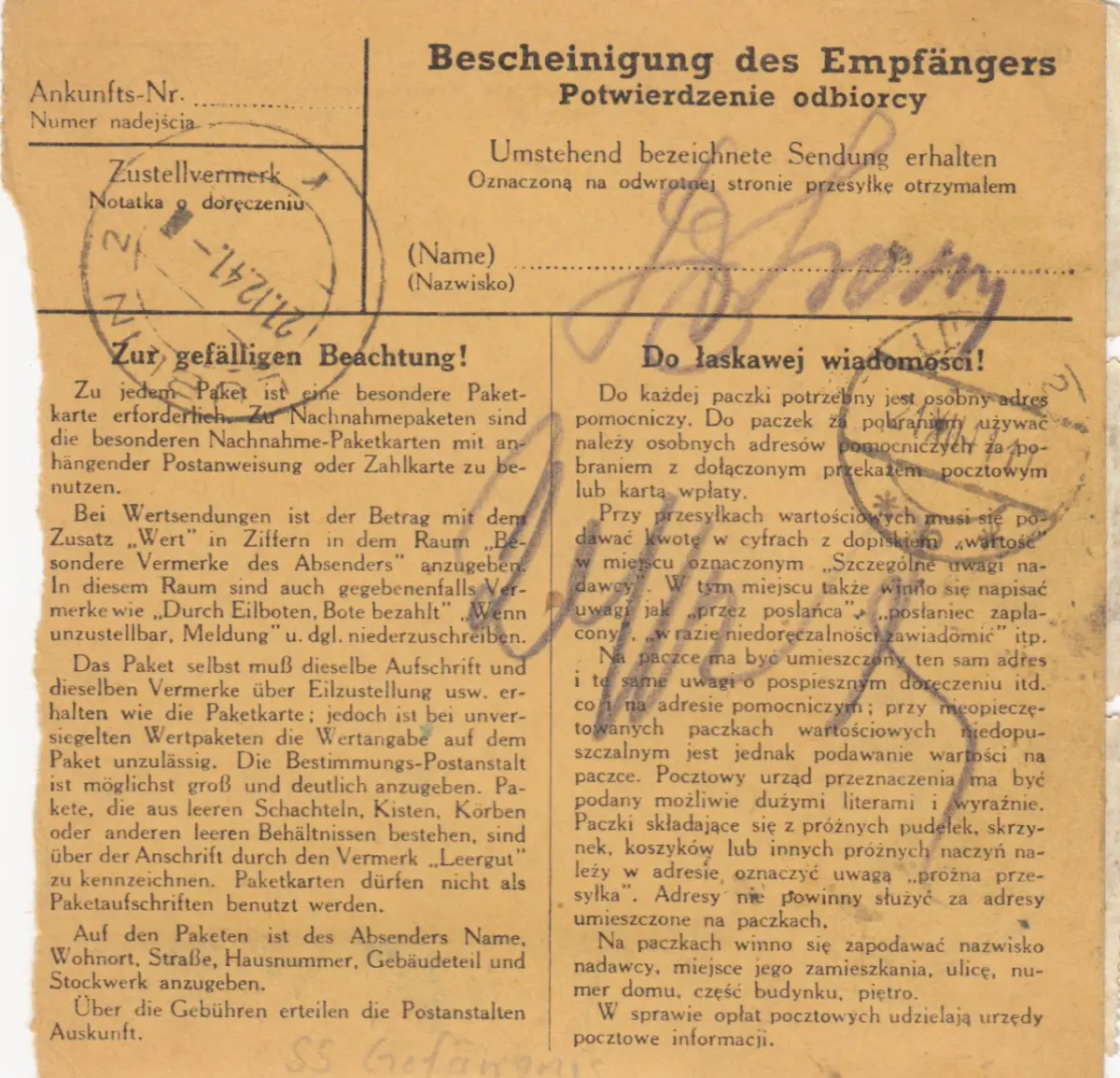 GG: Judaika: Carte de paquet Terespol n. Bug à la prison spéciale de Lublin