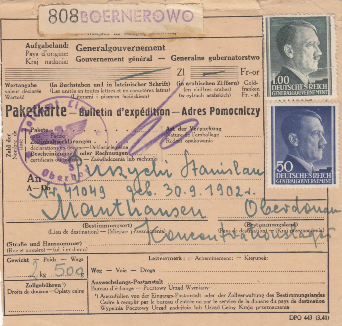 GG: Judaika: Carte de paquet Boernerovo à KZ Mauthausen