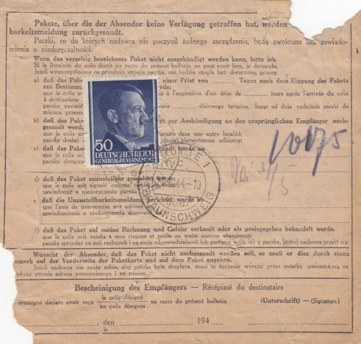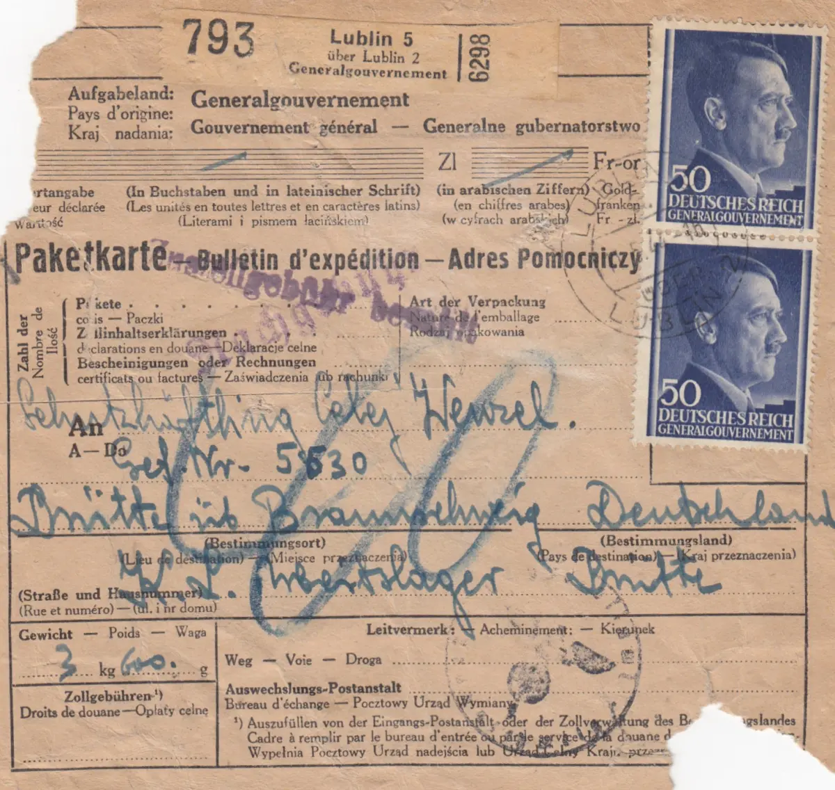 GG: Judaika: Carte de colis Lublin à KZ-Klager Drütte/Brunswick