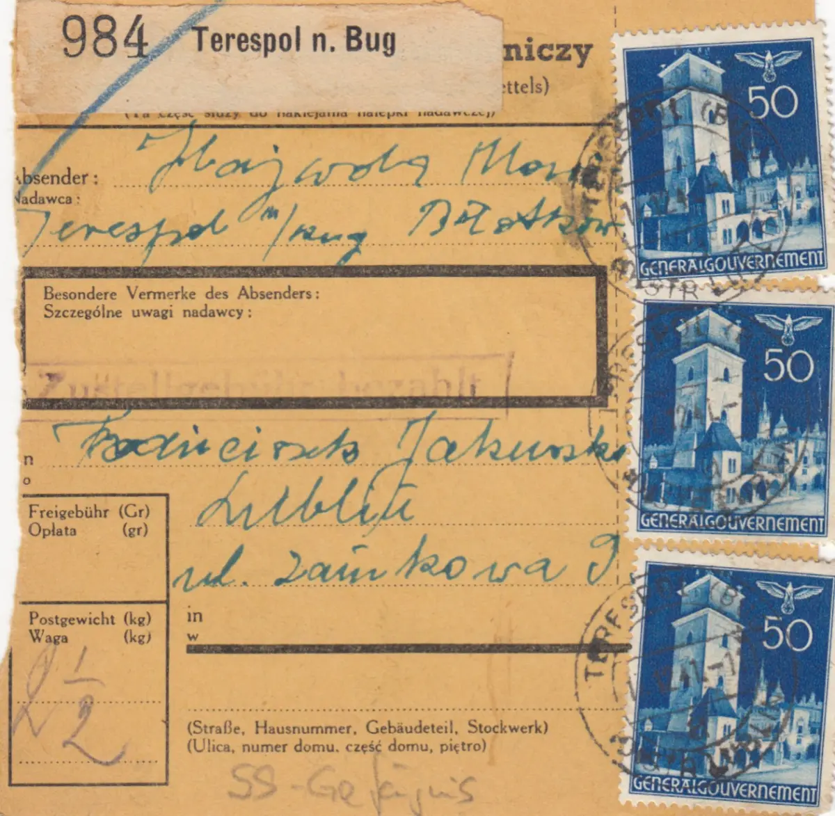 GG: Judaika: Carte de paquet Terespol n. Bug à la prison spéciale de Lublin