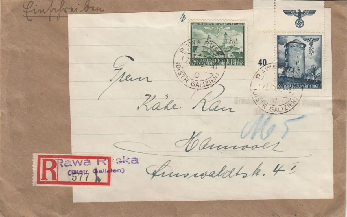 GG: Lublin 1Zl. MiF, portogerecht als Einschreiben Rawa Ruska nach Hannover, Eck