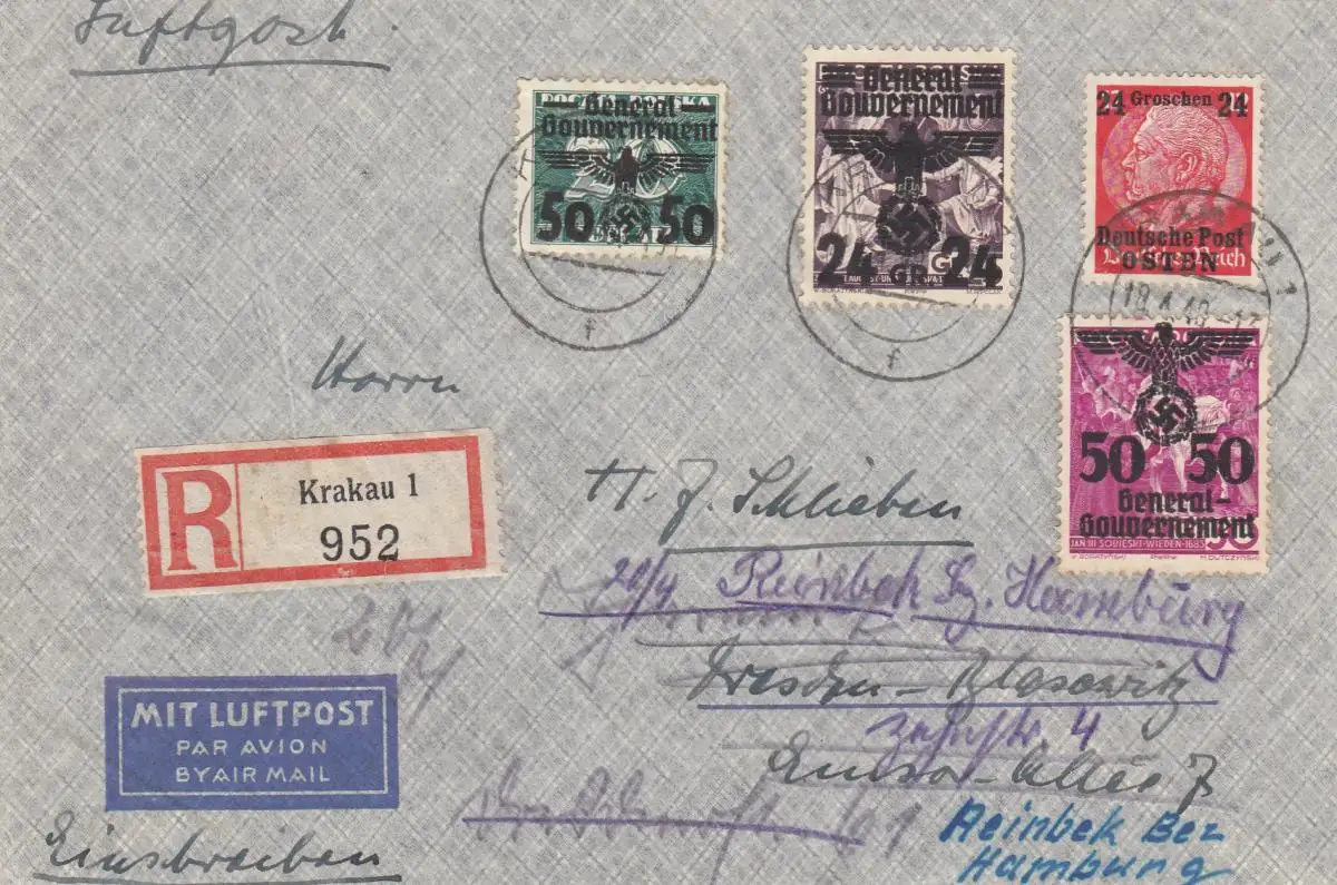 GG: Lettre postale aérienne recommandée Cracovie-Hambourg