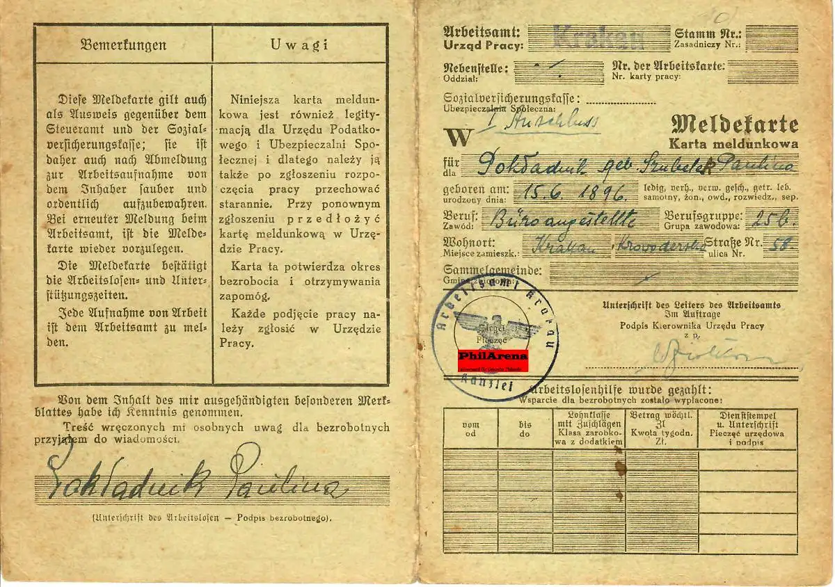 GG: Carte de rapport - Bureau de l'emploi de Cracovie 1941 Employés de bureau