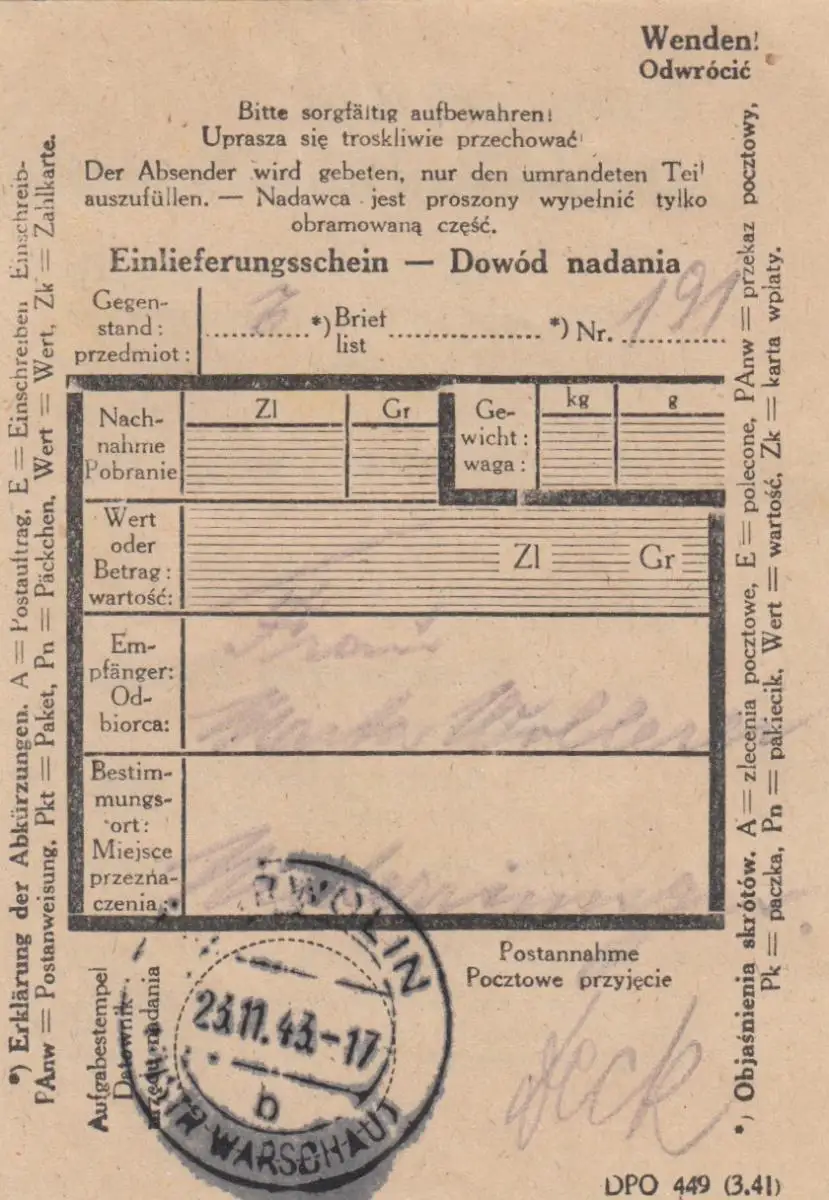 GG: MiF sur lettre de porto juste Garwolin à Niederrimsingen, E-Schein