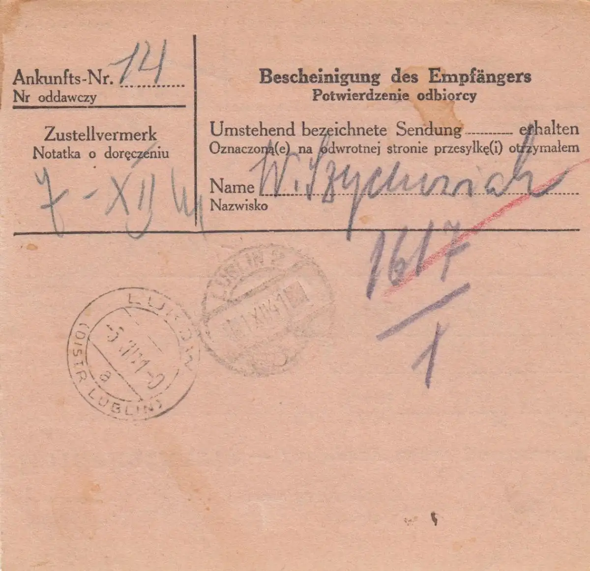 GG: Carte de colis d'urgence Lublin Hauptzollamt vers Adamow
