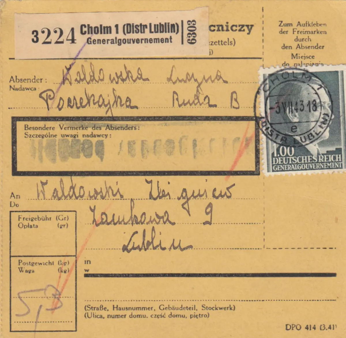 GG: Carte de colis Cholm vers Lublin, adresse prison à Lublin