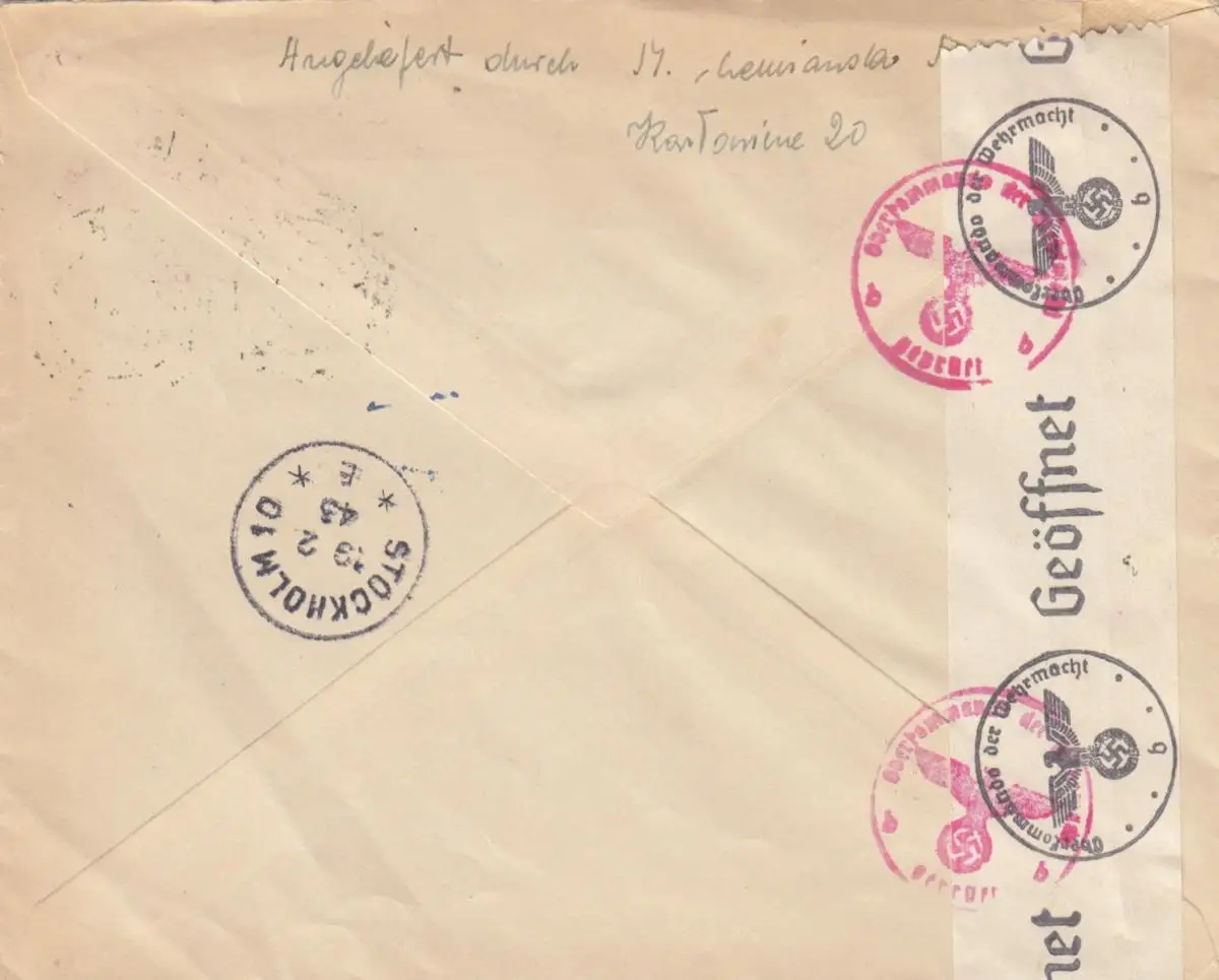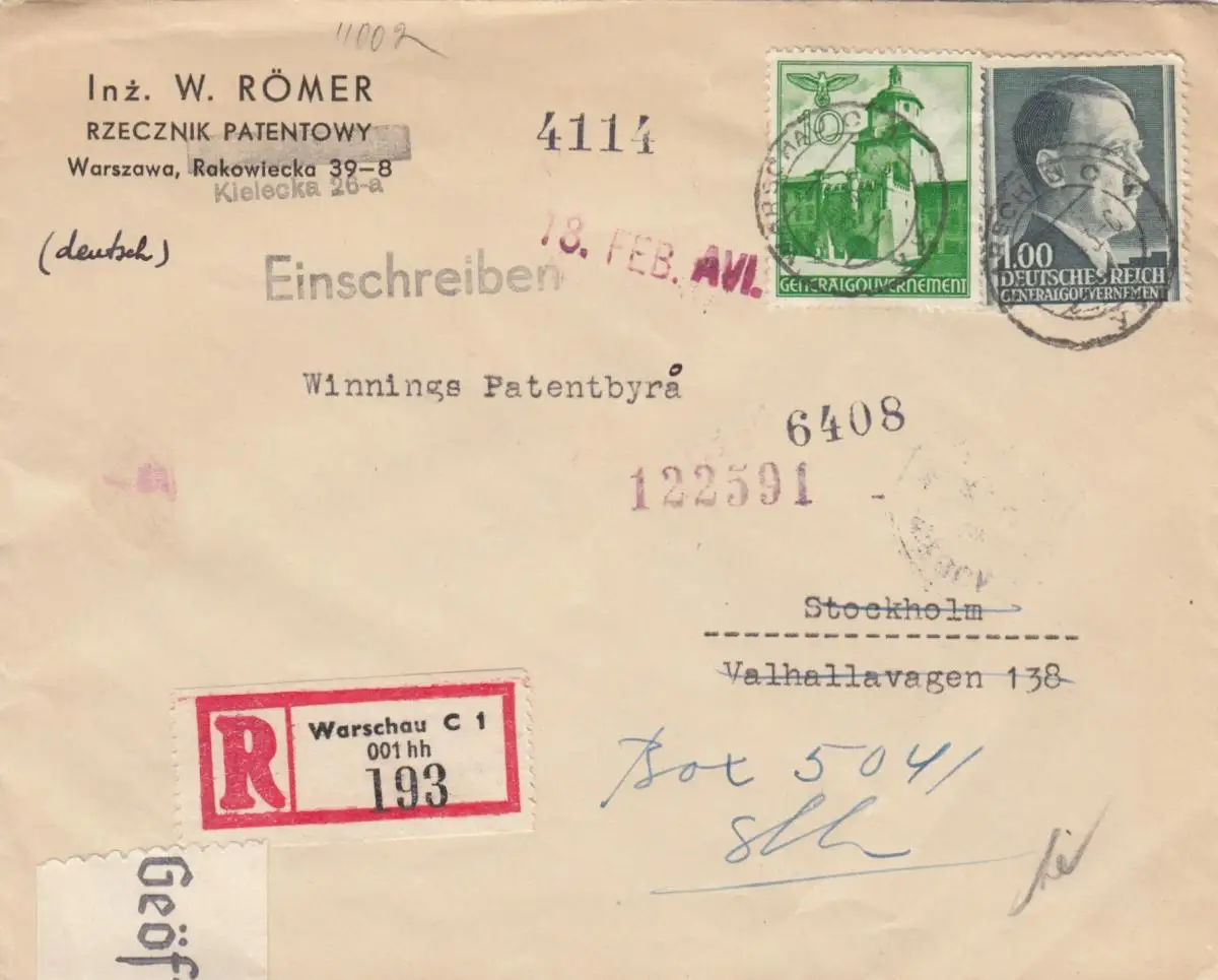 GG Suède: Lettre recommandé Varsovie à Stockholm, censure, portofach