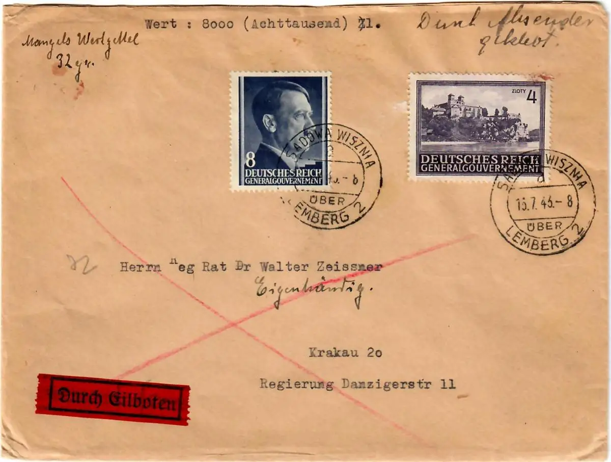 Voir Scan: Frais de traitement: 100 Frais d'indication de valeur: 160 Porto 48 Eilbote 80 Main propre 20 Somme: 408 ... et encore en l'absence de notes (les marques sur le bord d 'une pièce justificatives sont coupées du scan, sauf mention contraire) Generalgouvernement, General Government Article Nr.: 942749 Examen: Original Numéro d ’ article: 00000000924749