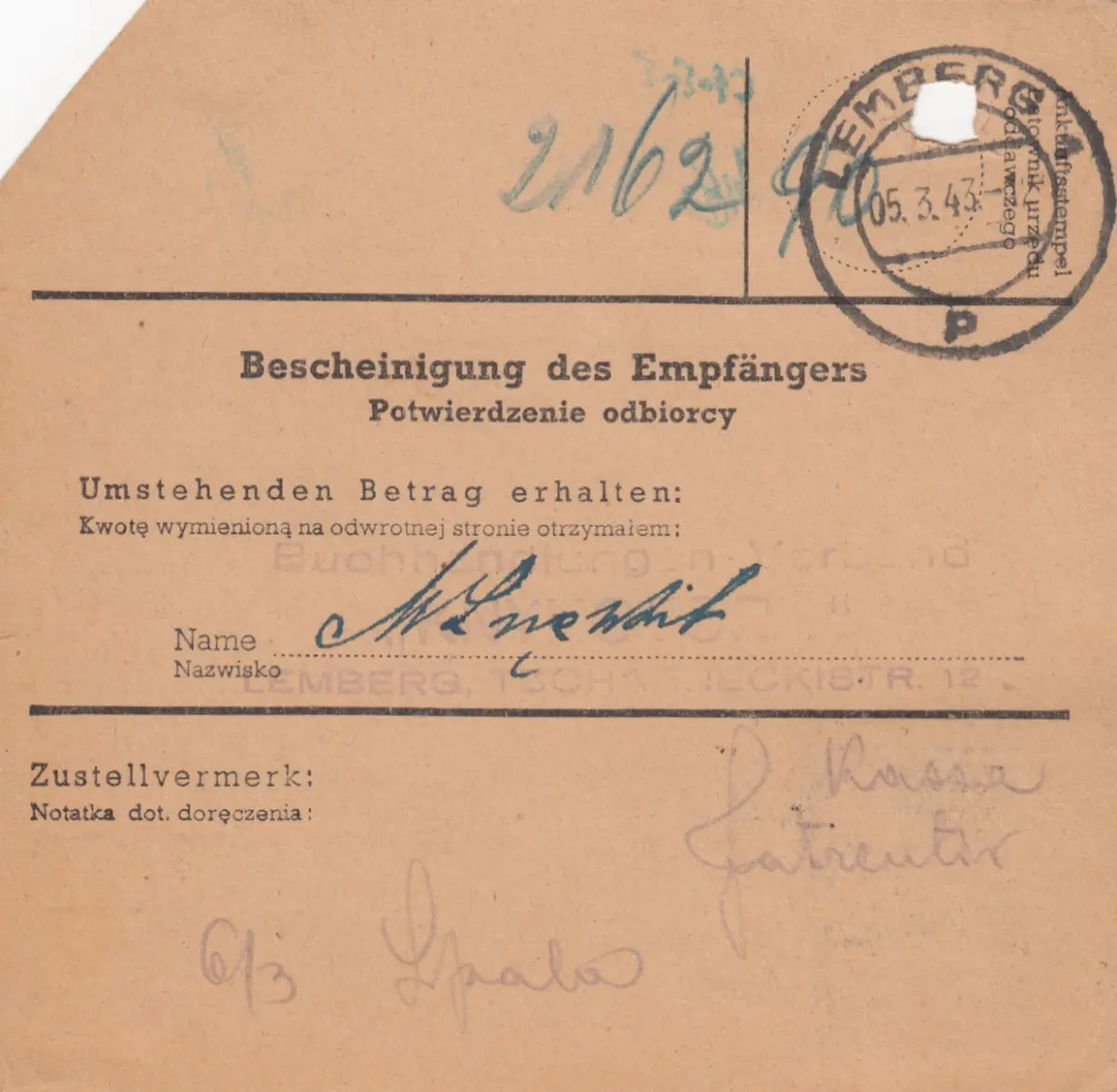 GG mandat postal Stanislau-Lemberg, DP Ost 5, EF 87A, portofach