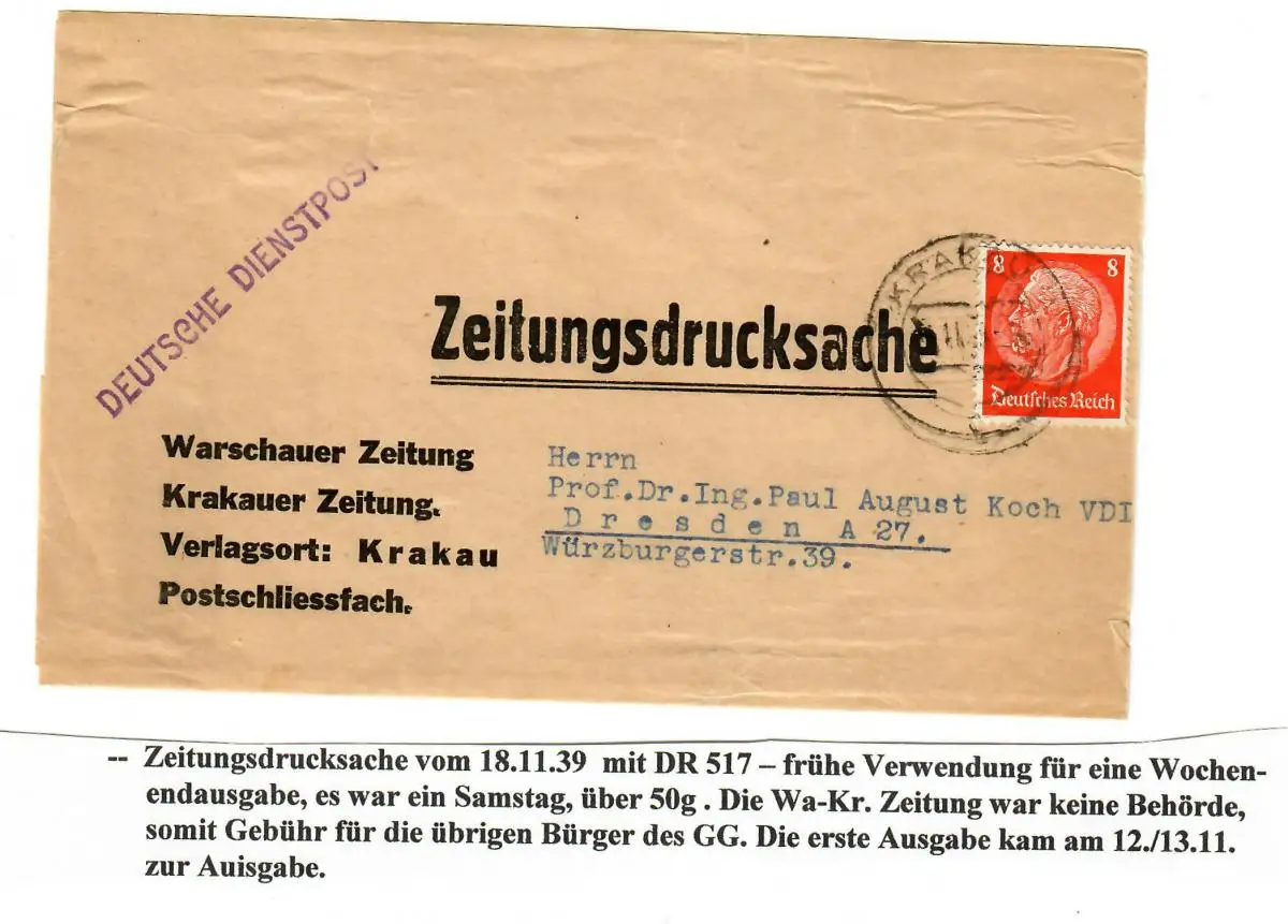 Bande de la Varsovie/Krakauer Zeitung après Dresde Frankatur avec 8 Rpfg pour une édition du week-end de plus de 50g. Frais majorés car pas autorité. Generalgouvernement Article Nr. 954014 Examen: original Numéro d'article: 00000000954015