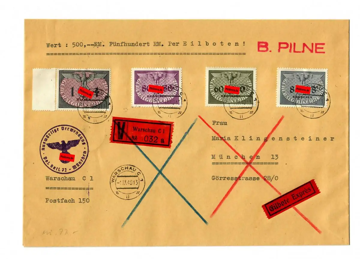 Voir Scan: Bandes de serrage au centre, probablement de la lettre précédente expéditeur: Pol. Batl. 72/Utilisation extérieure/Munich Generalgouvernement ArticleN° d'article: 702526 Vérification: original Numéro d ' article: 00000000702525