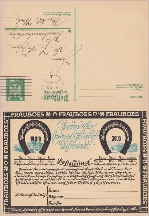 entier avec réponse, Braunschweig 1926 à Neubrandenburg, publicité loterie