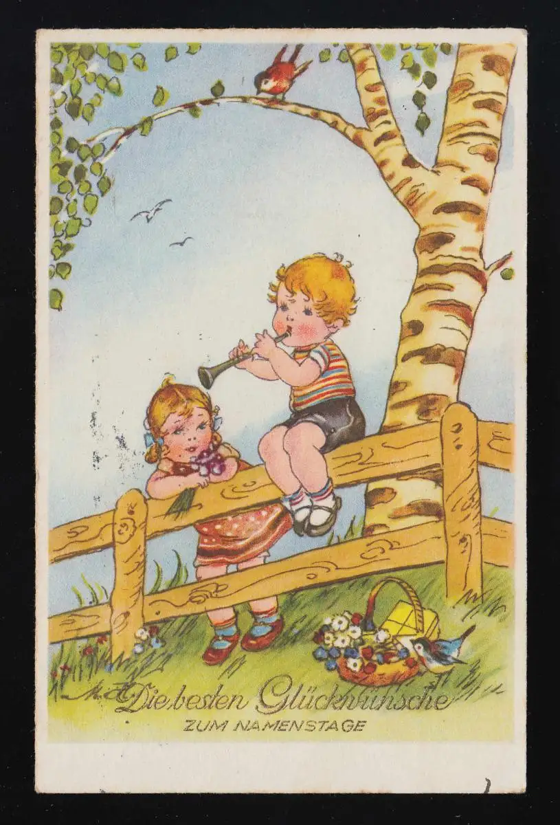 Garçon assis sur la clôture joue flûte, fille écoute le nom, Nuremberg 17.3.1941