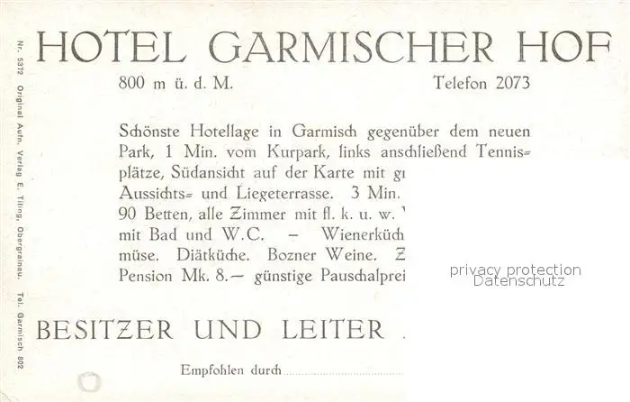 Garmisch Partenkirchen Kategorie Alte Ansichtskarten Postkarten bx71340 Garmisch Partenkirchen Garmischer Hof Garmisch Partenkirchen postalisch nicht gelaufen Werbekarte (keine Postkarte) Erhaltung siehe scans [WerneD78]