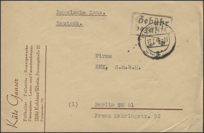 Payé-Temple Lettre Coblence 17.7.46 à Berlin