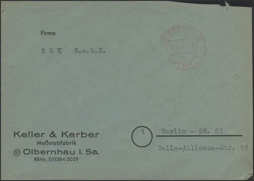 Payé-Temple Lettre Olbernau 19.11.45 vers Berlin