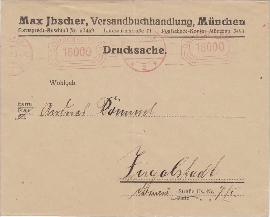 Frais payés: Lettre de Munich à Ingolstadt 1923, timbre gratuit rare