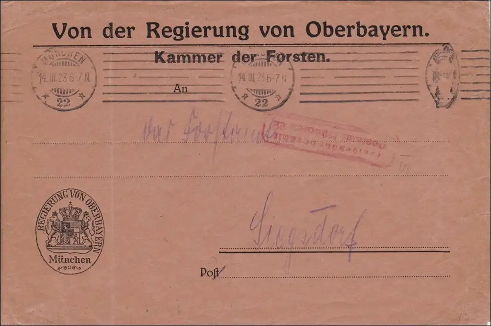 Frais payés: Lettre du gouvernement de Oberbayern 1923 Munich à Siegsdorf