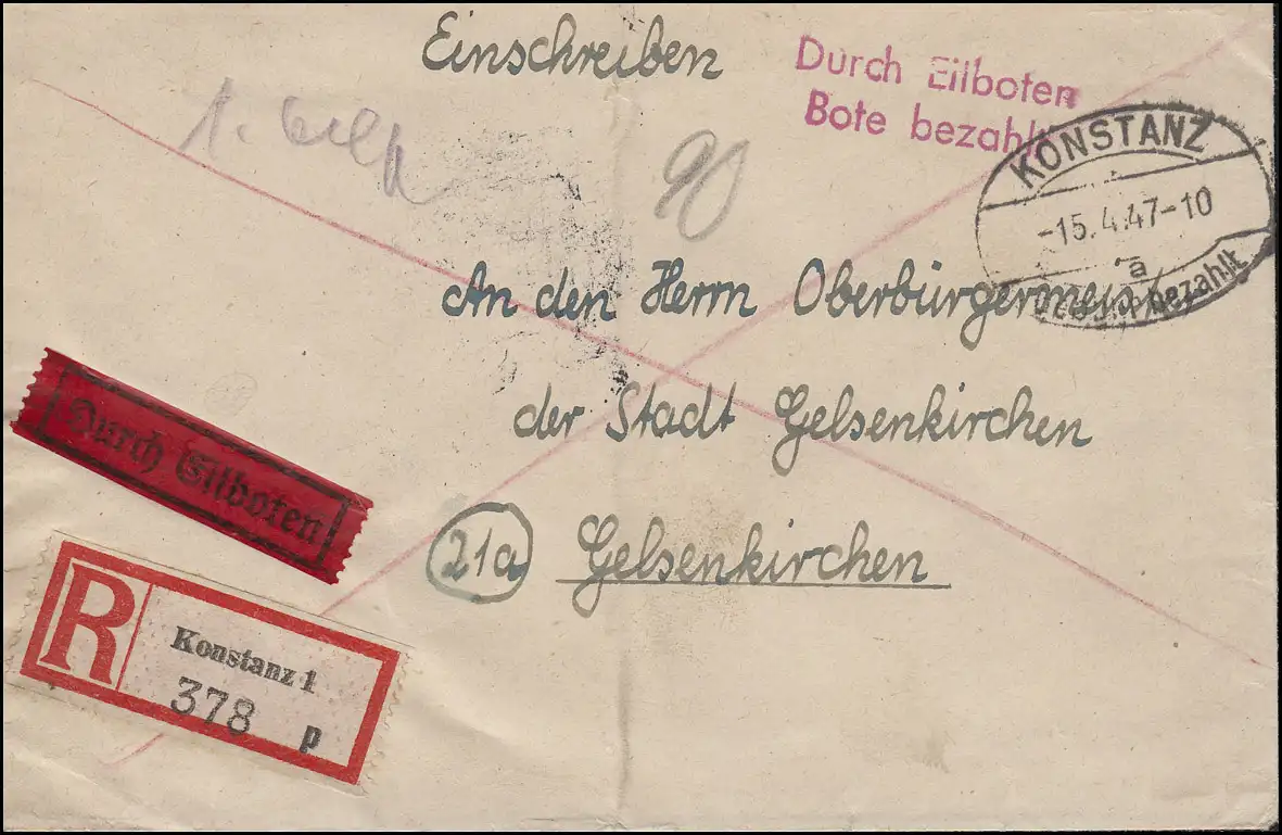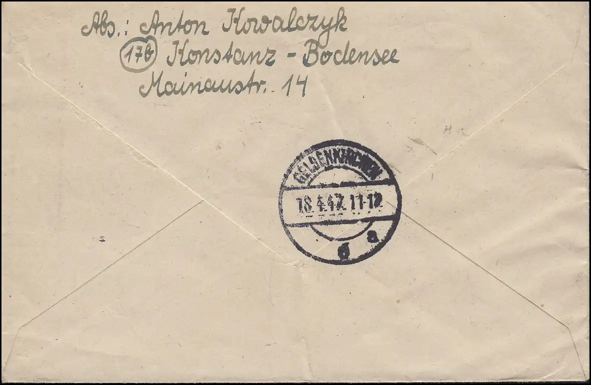 Temple payant Eil-R Lettre CONSTANZ 15.4.47 selon les Églises de Glesen 18.4.49