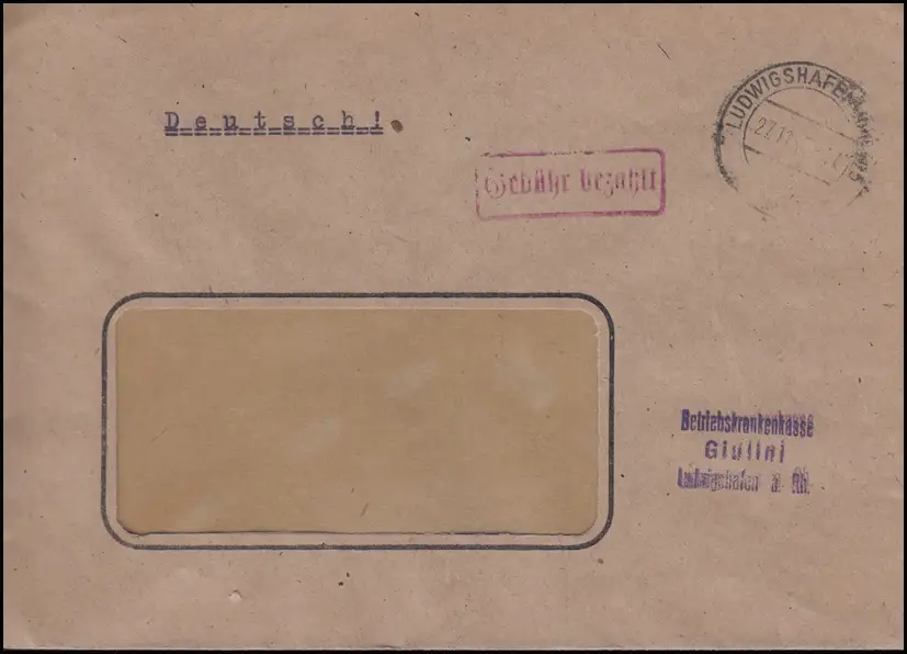 Temple payant de fenêtre-Bf. Caisse de maladie d'entreprise LUDWIGSHAFEN 27.11.47