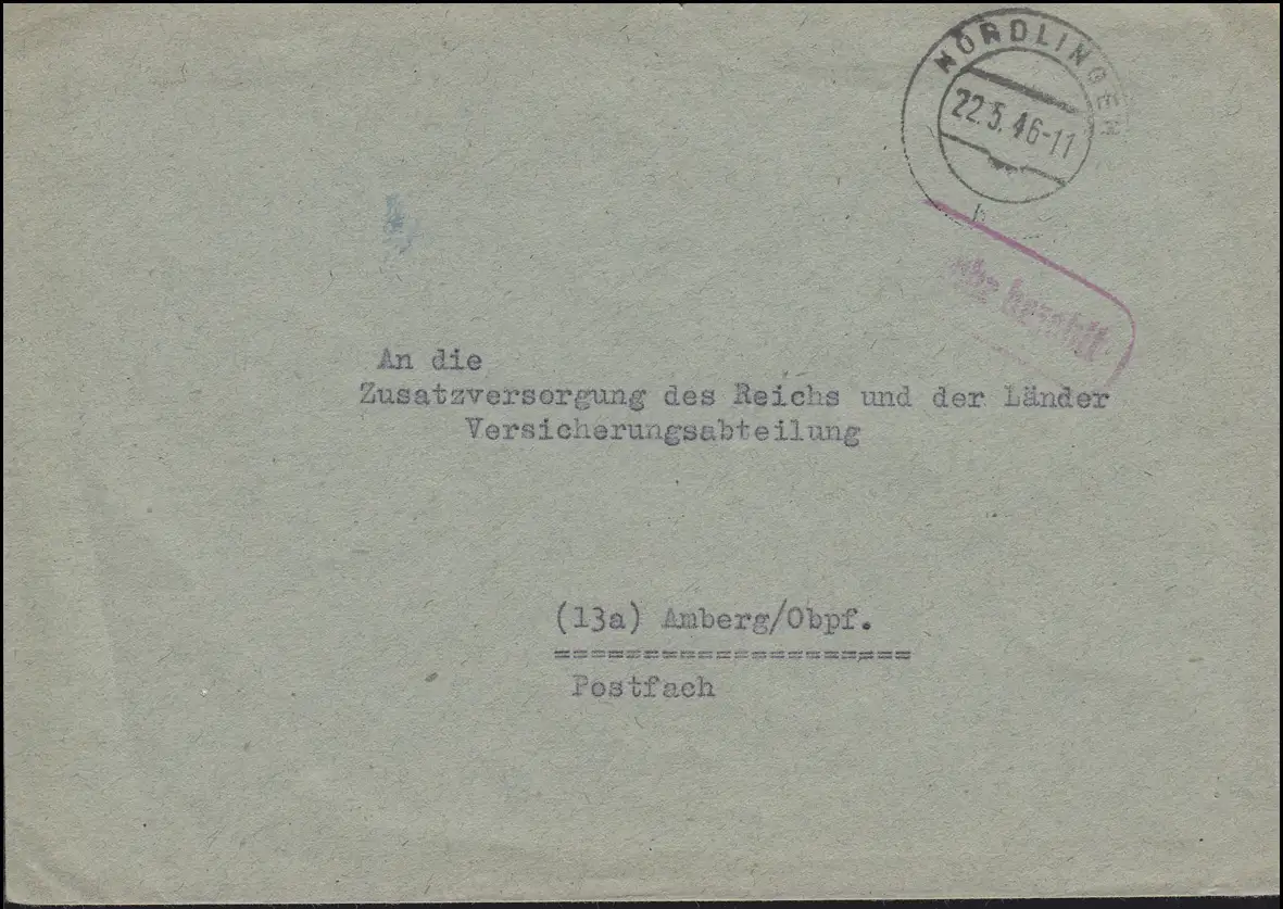 Temple payant sur lettre NÖRDLINGEN 22.5.1946 à Amberg