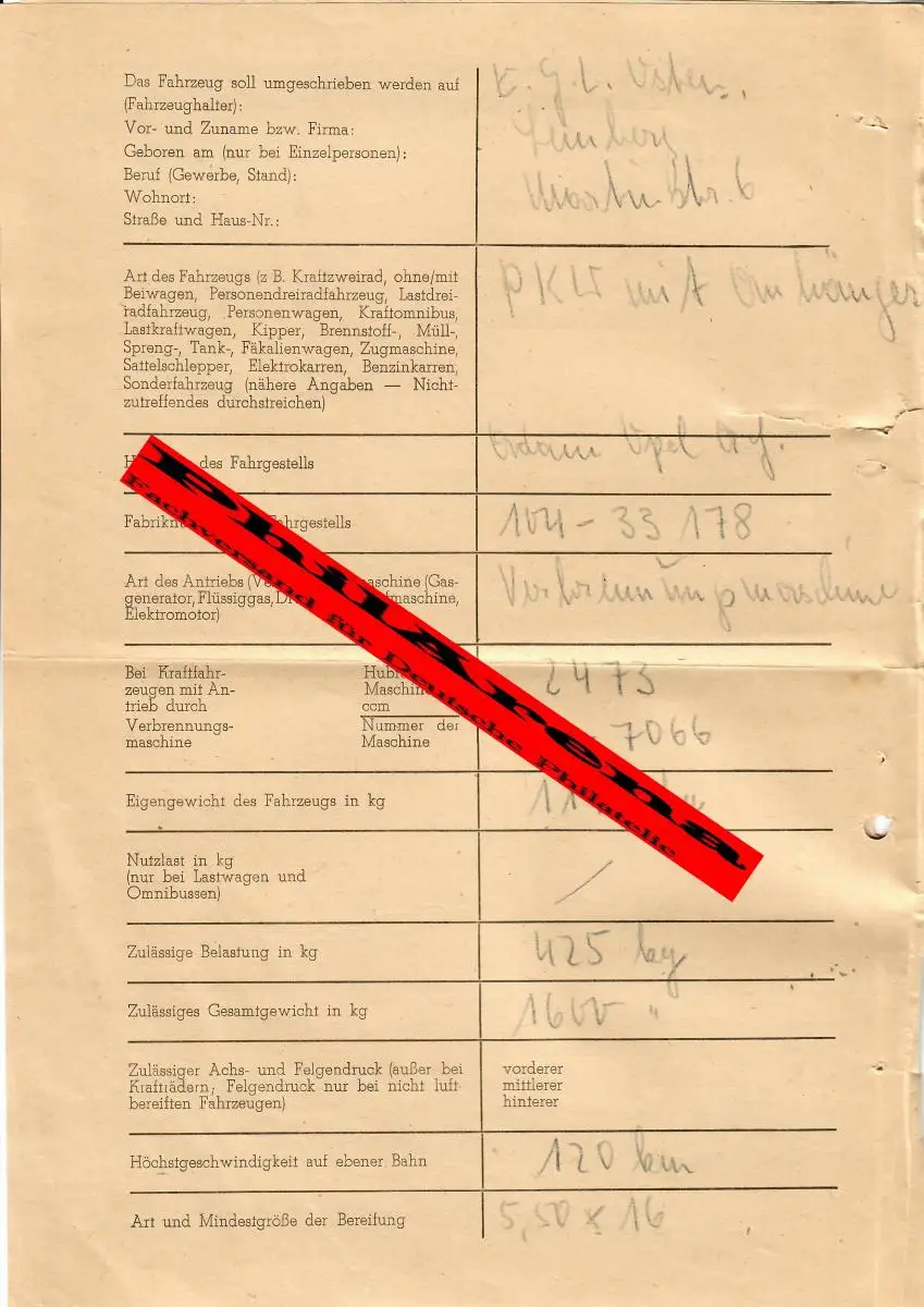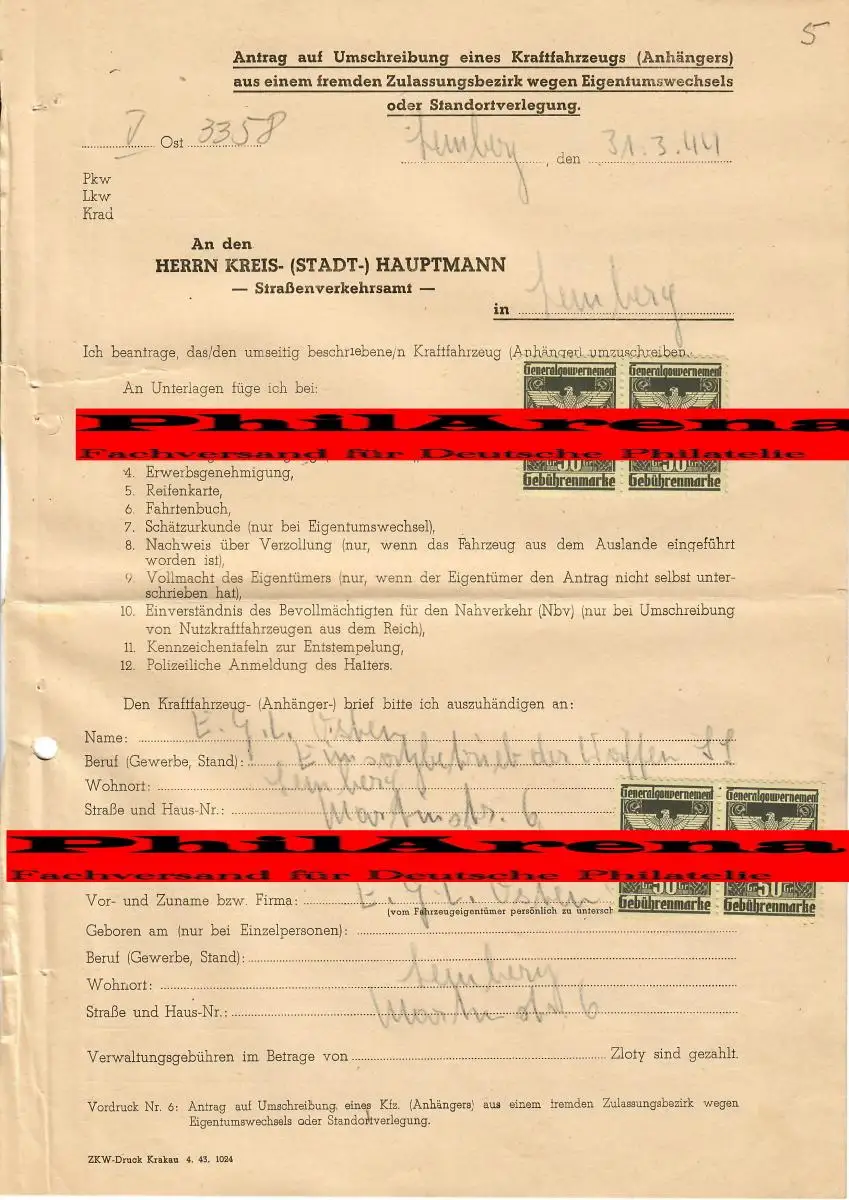 Gouvernement général GG: Demande de conversion de voiture avec remorque OPEL, Lemberg 1944