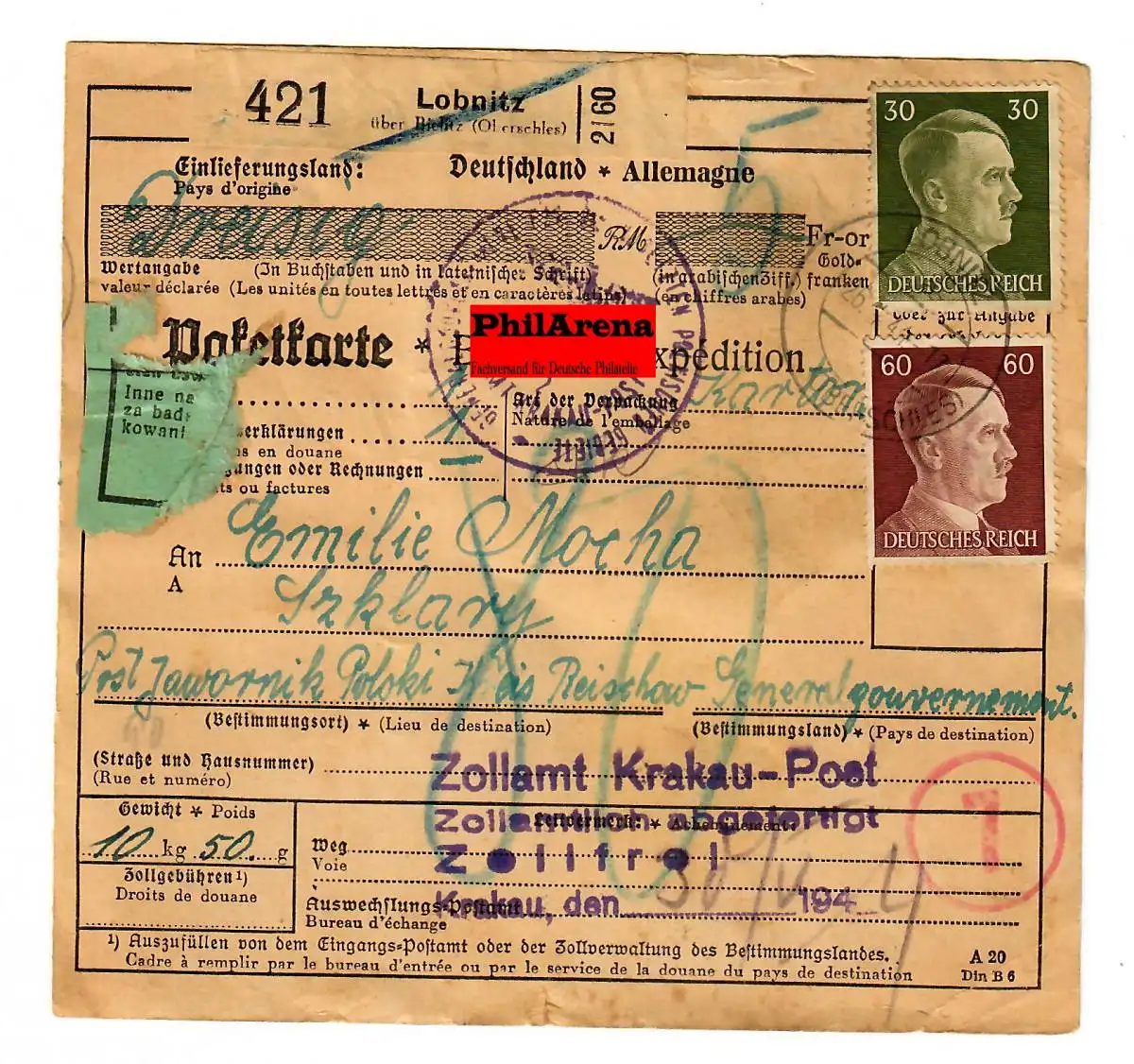 Carte de colis étranger de Lobinitz via Bielitz/Obersilesien vers Jawornik, Kreis Reichshof, cachet du bureau des douanes de Cracovie, taxe de douane de 80 gr. Valeur pour plus d'informations voir l'article Scan n° 954313 Contrôle: original Numéro d ' article: 00000000954312