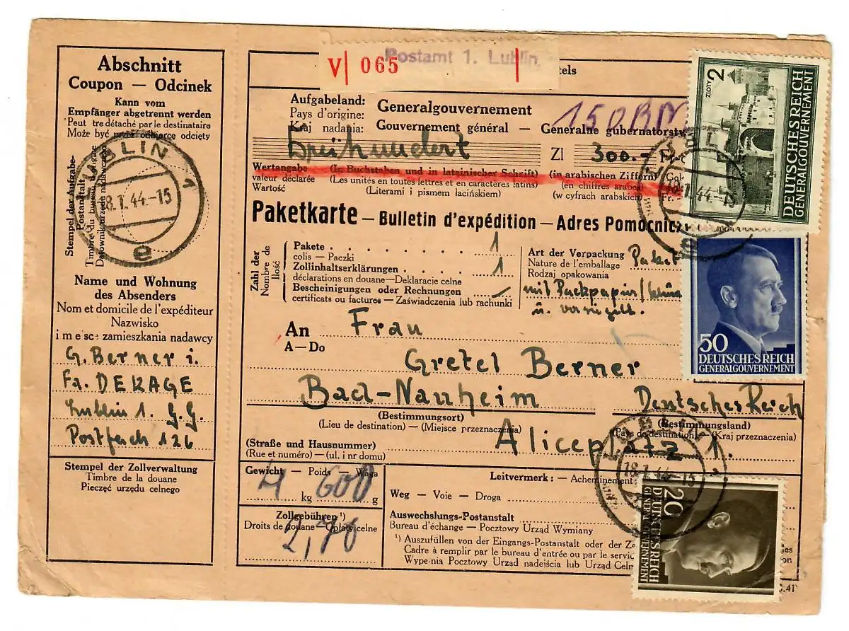 Gouvernement général GG Forfait de valeur à l'étranger Lublin - Bad Nauheim, 1944