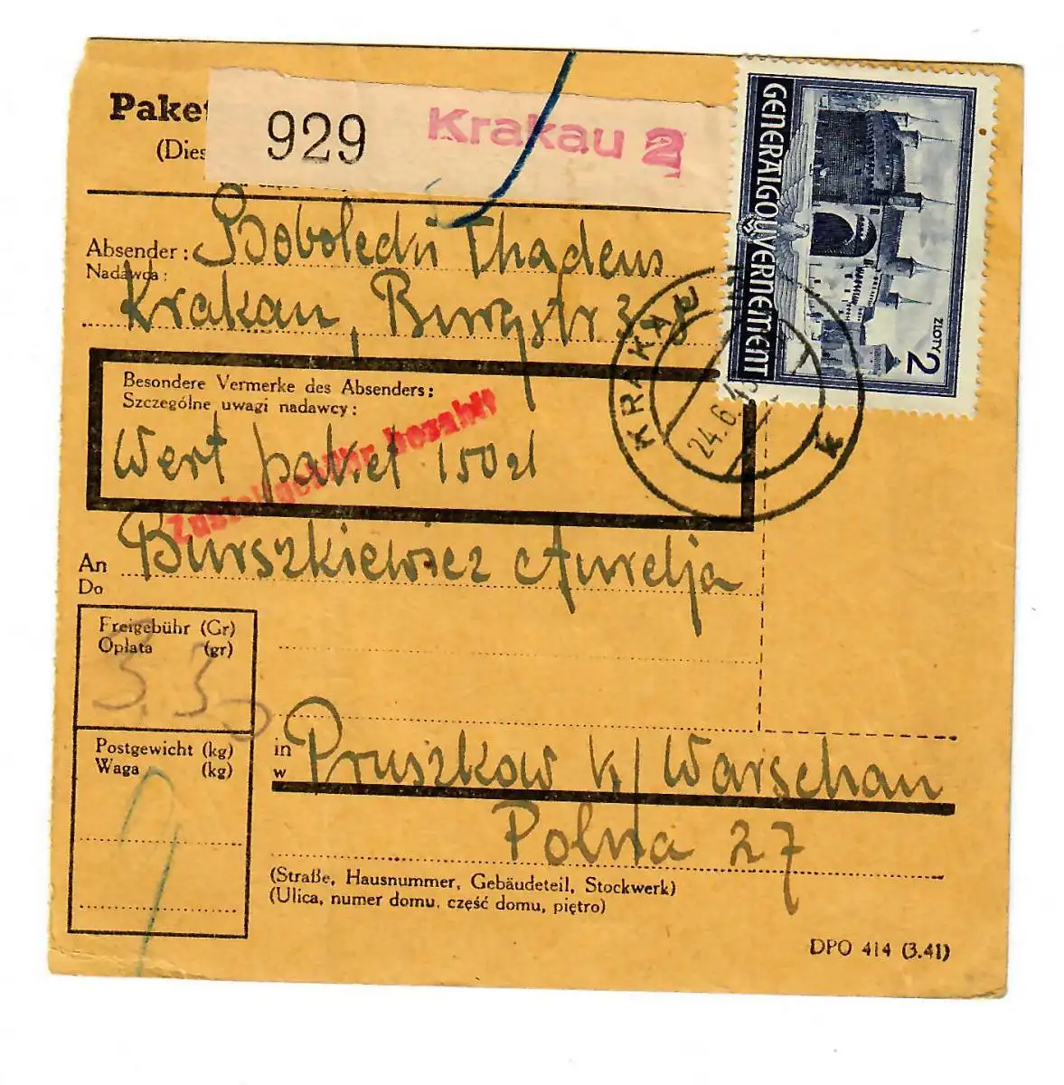 Carte de colis de Cracovie à Pruszkov à Varsovie avec indication de la valeur et frais de livraison payés. Pour plus d'informations voir l'article Scan n° 954287 Vérification: original Référence produit: 00000000954288