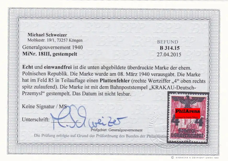 Gouvernement général (GG) MiNr. 18III, cacheté, BPP Photos trouvés