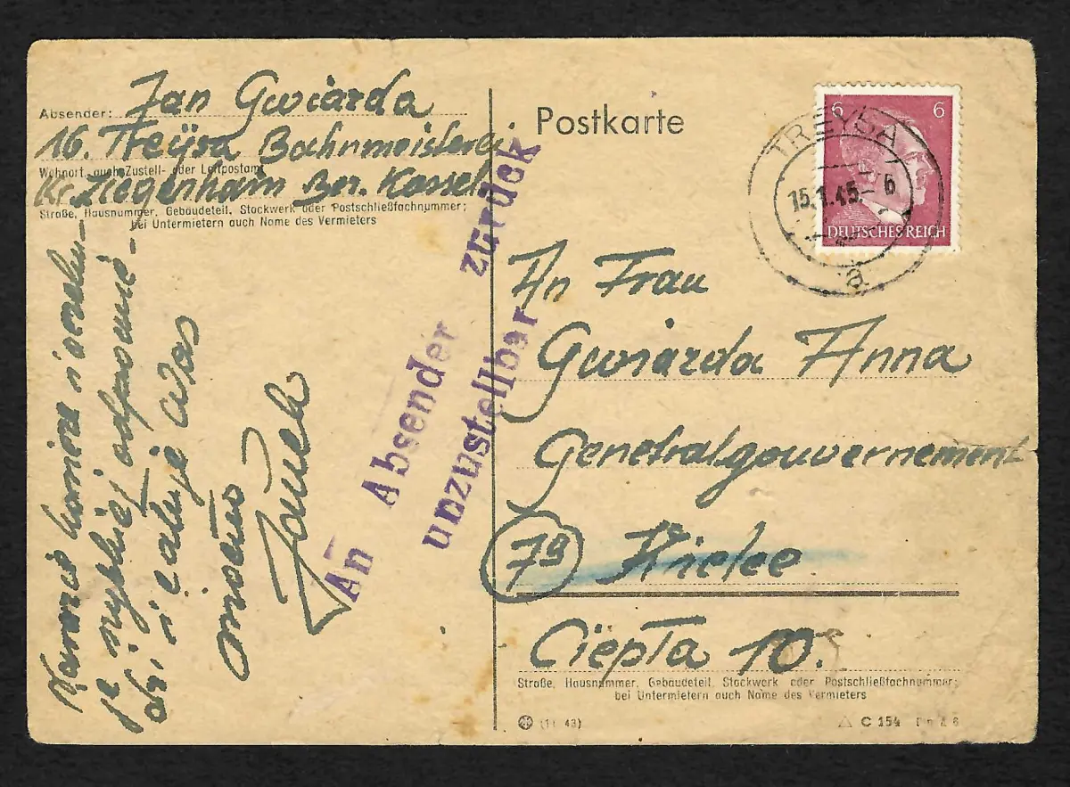 Generalgouvernement GG: Späte Post: 15.1.45:Treysa nach Kielce - Postsperre