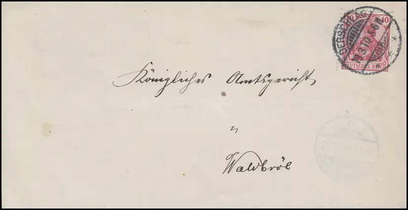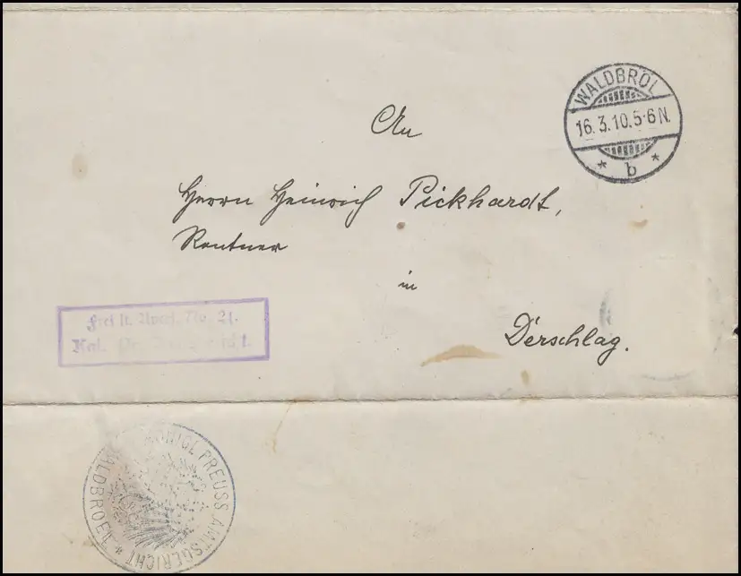 Lettre au tribunal royal de Waldbröl. Interne: Disponible selon Avers no 21 / Königlich Preussisches Amtsgericht WALDBRÖL 16.3.10 après Derschutz Examen: original Référence produit: 00000000025585