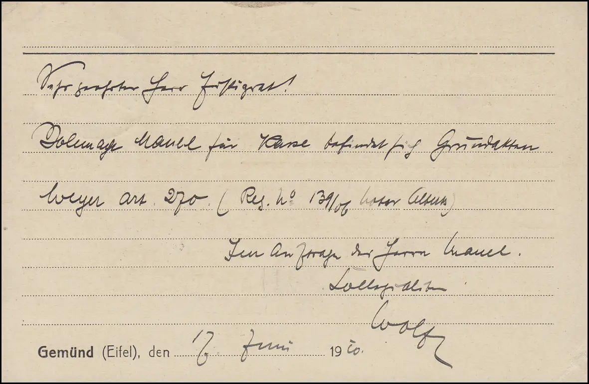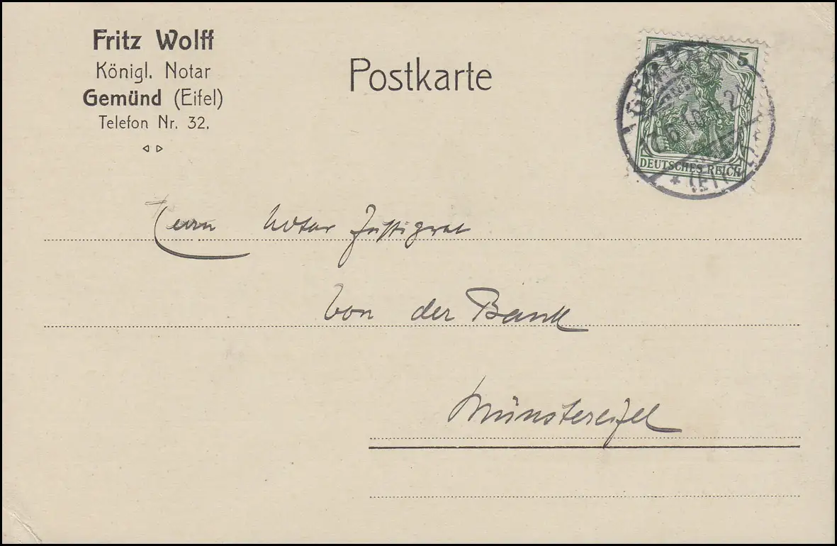 Germania 5 Pf. EF Carte postale Königl. Notar Fritz Wolff GEMÜND / EIFEL 17.6.10