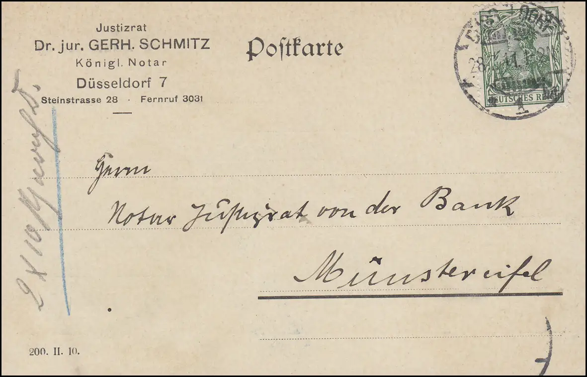 Germania 5 Pf. EF Carte postale Königl. Notaire Dr. Schmitz DÜSSELDORF 1 - 28.7.11
